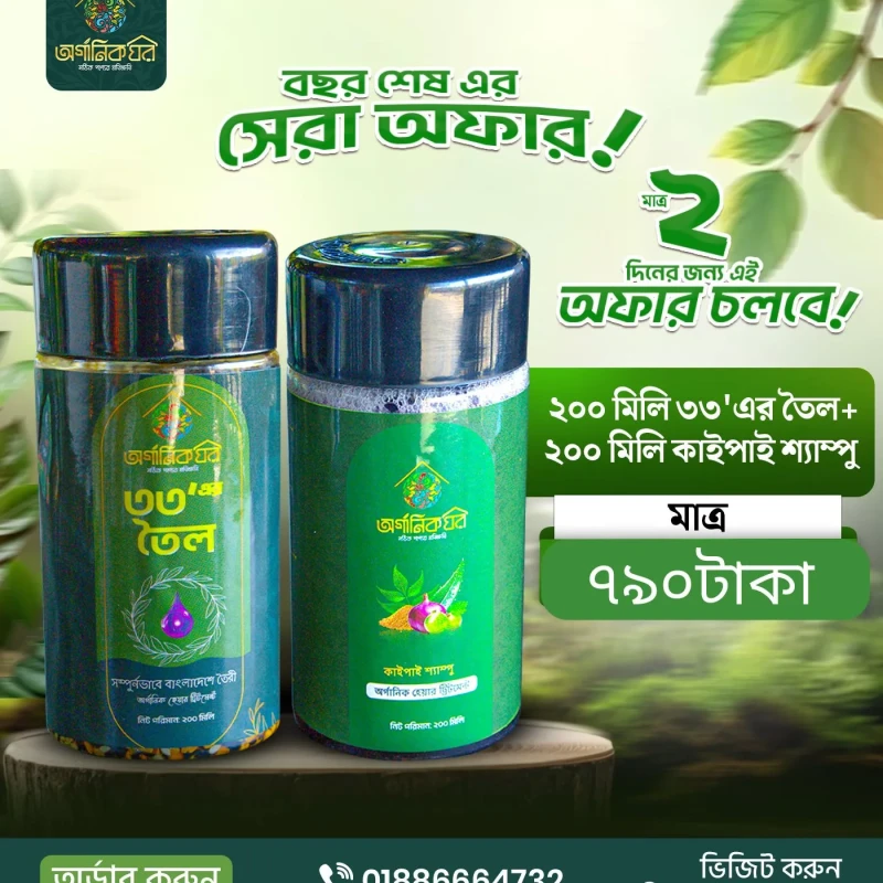 ২০০মিলি ৩৩'এর তৈল ১টি সাথে ২০০ মিলি কাইপাই শ্যাম্পু পাচ্ছেন মাত্র ৮৯৯ টাকা মাত্র